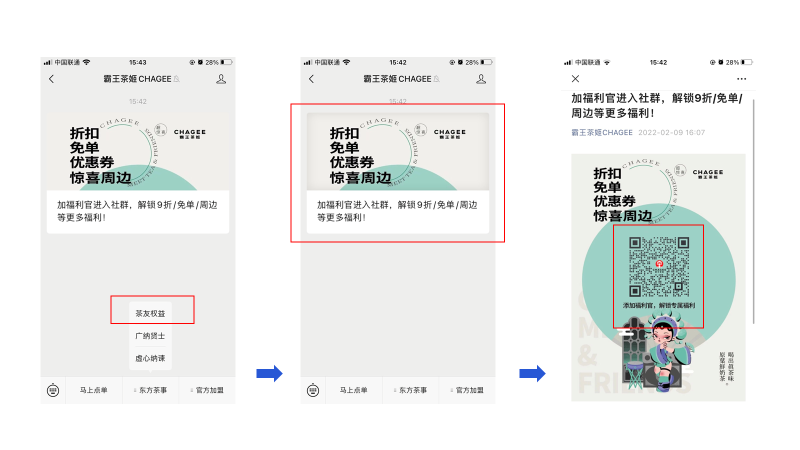 公众号的流量导入,「霸王茶姬」选择在公众号的菜单栏中设置获客入口,即点击菜单按钮,弹出引流海报,客户扫码即可加微。